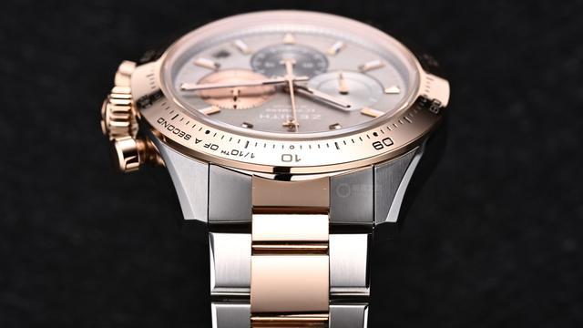 当镂空家族将El Primero星速机芯的机械美学推向极致,真力时并未止步于视觉表达,而是进一步思考高级运动计时码表如何突破场景限制。为兼顾运动、商务、休闲场景,品牌推出了全新的旗舰系列运动腕表精钢玫瑰金双色限量款(型号:51.3102.3600/01.M3100)。
