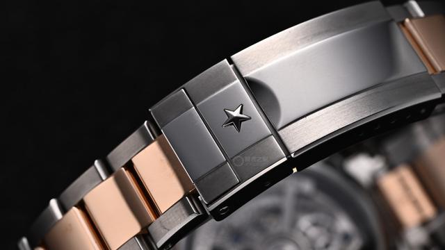 表链采用一体式的精钢+18K玫瑰金结构,中央链节采用玫瑰金材质,与表圈、表冠形成视觉呼应。链节经拉丝与抛光交替处理,更显奢华。除此之外,还附赠一条黑色橡胶表带,适配更多佩戴场景。但如果一定要提出一点不足,那就是真力时目前还没有配备与镂空计时款一样的全新ZENCLASP™专利折叠式表扣,而是依旧沿用过往经典的双折叠式安全表扣,至于未来何时会应用,值得期待。