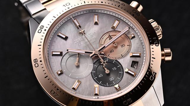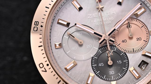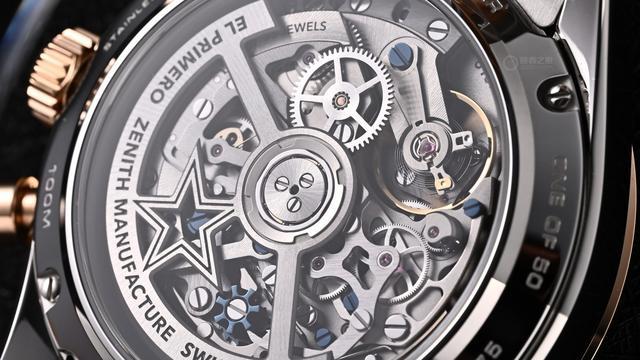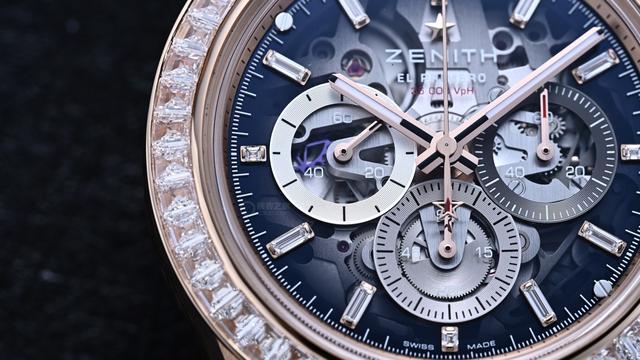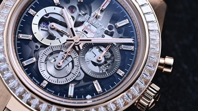 3、6、9点位的三个副盘采用品牌标志性的三种不同颜色,且交叠放置。3点位处为60秒钟计时盘,6点位处为60分钟计时盘,9点位放置小秒盘。与镂空款一样,得益于内部的El Primero星速高振频机芯,中央秒针每十秒就旋转一圈,这也是3点位单独使用60秒计时盘的独特原因。