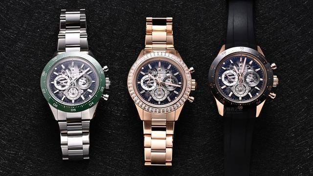 四款旗舰系列运动腕表镂空款,组成了一个阵容整齐的“镂空家族”。三款不限量的常规版本组成了基础阵容:精钢黑陶瓷表圈款(03.3130.3600/01.M3130)搭配品牌标志性的三色计时盘、精钢绿陶瓷表圈款(03.3131.3600/01.M3130)搭配灰色计时盘两款作为入门选择,而18K玫瑰金黑陶瓷款(18.3130.3600/01.R951)则是奢华与实用性的巧妙兼顾。