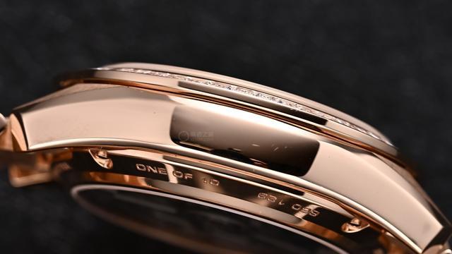 表壳采用41毫米的18K玫瑰金材质,表圈镶嵌有50颗VVS级长阶梯形切割钻石,总重约5克拉。虽然无法延续陶瓷表圈上清晰读取1/10秒的便捷性,但钻石表圈的璀璨流光不失为精准之外的另一重表达。