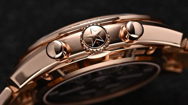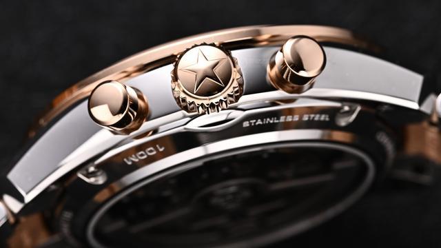 表壳经过拉丝与抛光交替处理,经典的泵式计时按钮被传承下来。除此之外,该腕表具备100米的防水能力。