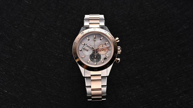 表壳延续41毫米标准尺寸,采用精钢与18K玫瑰金双色组合。表壳主体和外缘采用精钢材质,兼顾坚固性与抗刮耐磨性,表圈、表冠、计时按钮采用18K玫瑰金材质,中和精钢的冷硬感,玫瑰金也在精钢的对比下更具奢华感。